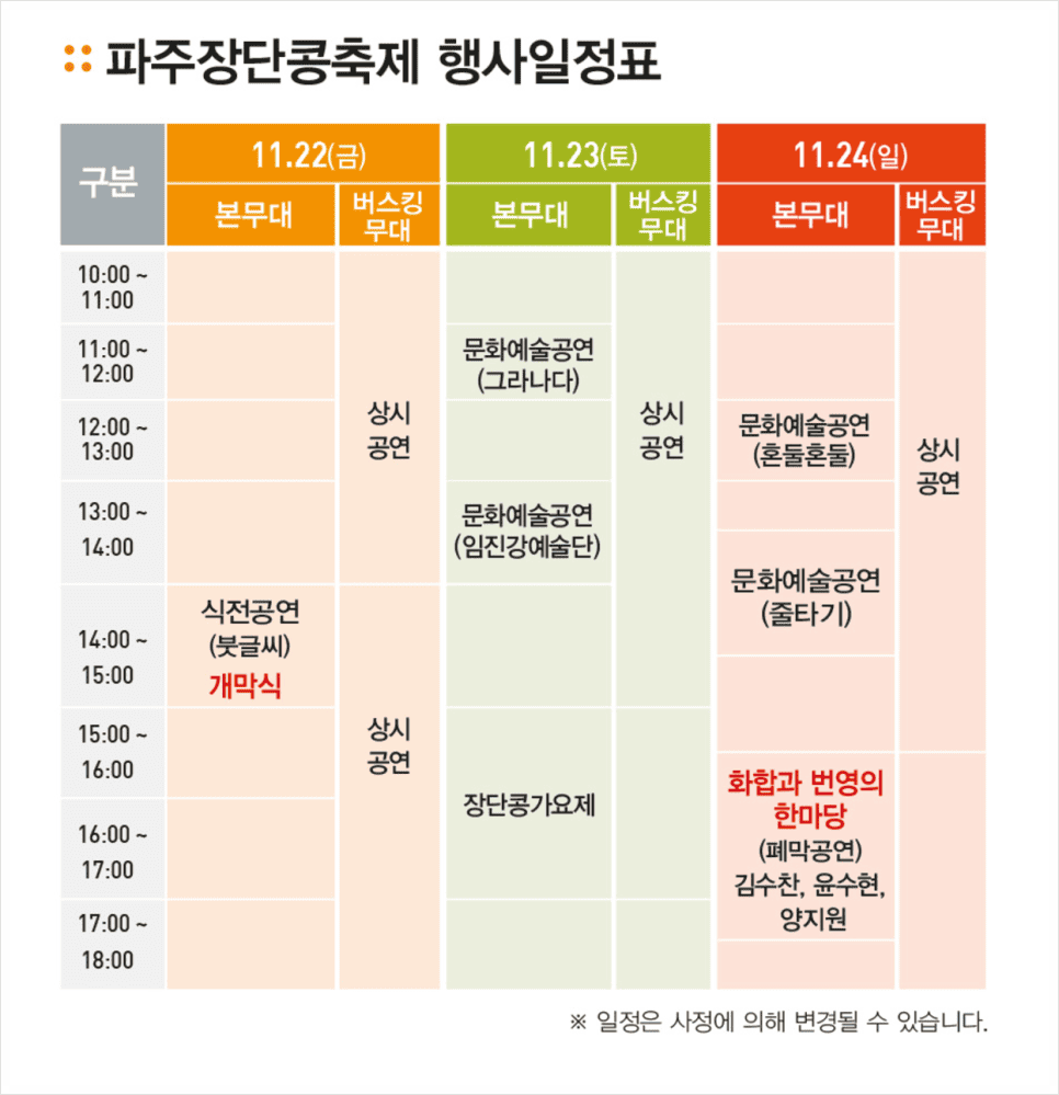 11월 22일 본무대에서 식전 공연 개막식이 열리고 상시공연이 펼쳐집니다. 다른 날도 아래와 비슷하게 열리니 참고하시면 되겠습니다. 공연은 여러 시간대에 나눠져 있어 방문객들이 다양하게 즐길 수 있도록 일정이 나눠져 있습니다. 공연일정을 자세히 확인하고 싶으신 분들은 아래를 확인해 보시길 바랍니다.